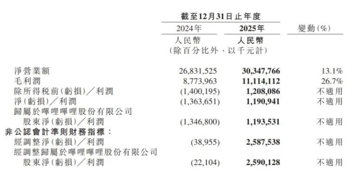 3月5日晚,哔哩哔哩发布2025年第四季度及全年财报。全年总营收303.5亿元,同比增长13%;全年净利润11.9亿元,首次实现年度盈利,扭亏幅度超过25亿;经调整净利润25.9亿,利润率8.5%。