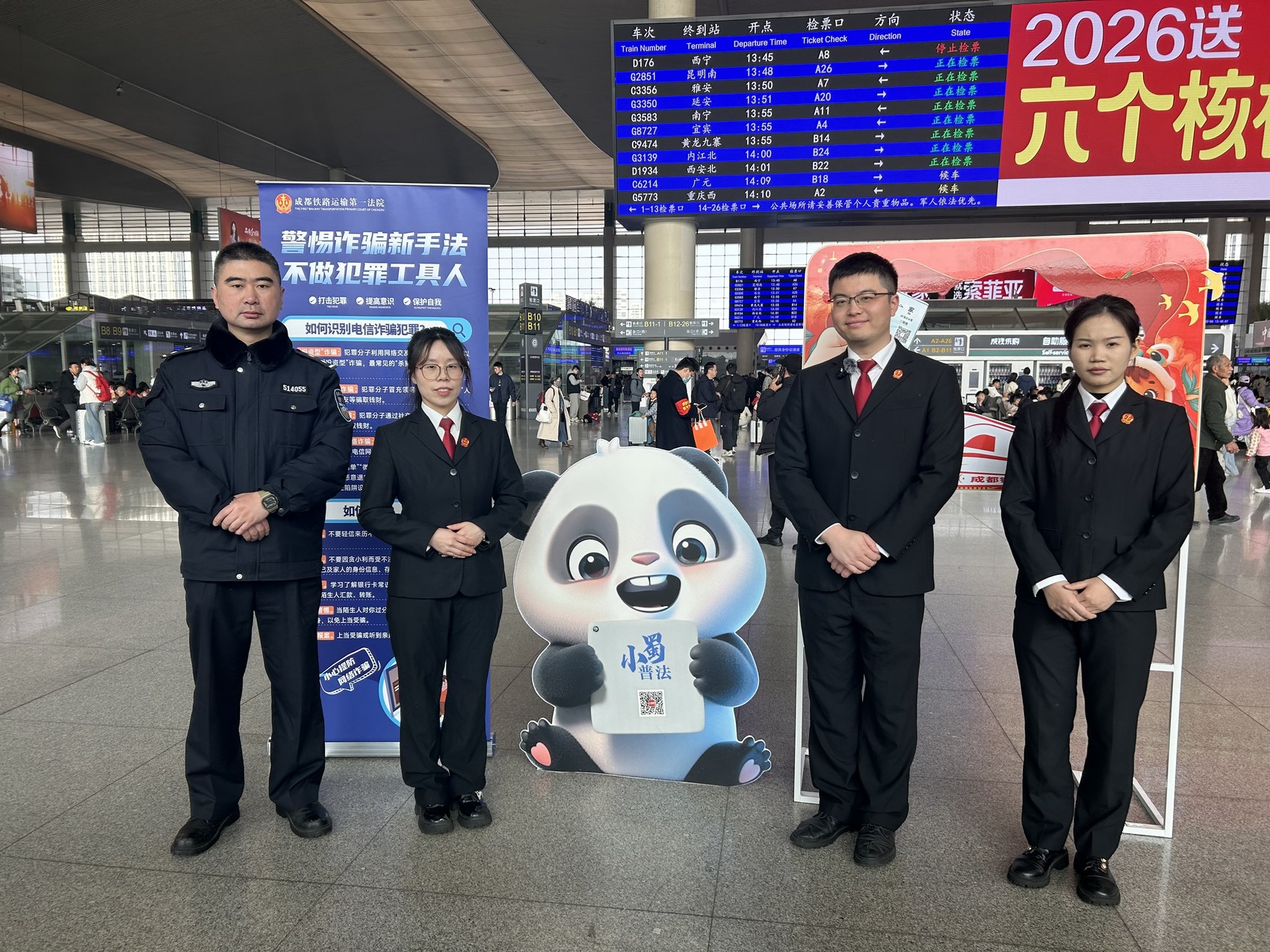 法官与“小蜀”走进成都东站开展普法活动。